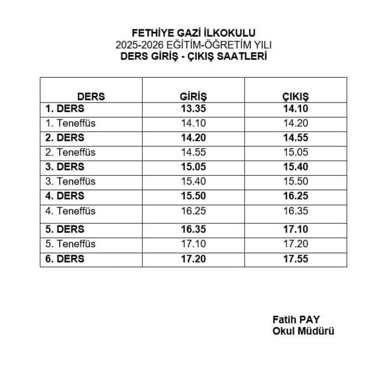 Bakanlığımız Strateji Geliştirme Başkanlığının okul ve kurumların birleştirilmesi, okul türlerinin değiştirilmesi, binaların takası ve ortak kullanımı hakkındaki yazıları gereği ve Fethiye Kaymakamlığının 01/09/2025 tarihli Oluru gereği, ilçemiz Fethiye Gazi Ortaokulunun okulumuza taşınmasına ilişkin 08/09/2025 tarihinden itibaren okul binalarımızda ikili öğretime geçilecek olup, ilgili tarihten itibaren Okul Giriş-Çıkış Ders saatlerimiz aşağıda belirtilmiştir.